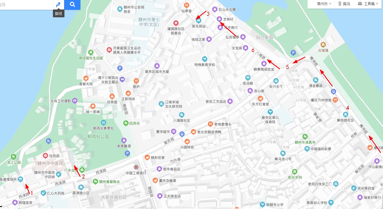 三、限流管理期間,持有通行證的郁孤臺街區(qū)內(nèi)居民或車輛,請統(tǒng)一從八境路支巷景區(qū)入口(國力教育、贛七中方向)進出。路線方案為:濂溪路(如圖紅色標記4)→章貢路(如圖紅色標記5)→八境路(如圖紅色標記6)→八境路支巷景區(qū)入口(如圖紅色標記3)。
