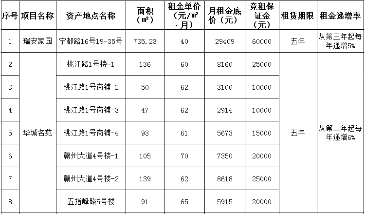 贛州振興實業(yè)有限責(zé)任公司委托江西潤資拍賣有限公司,定于2020年10月22日10:00開始在贛州市公共資源交易中心(長征大道9號)進行國有資產(chǎn)公開招租,現(xiàn)歡迎符合條件的單位或個人前來報名參加競租。