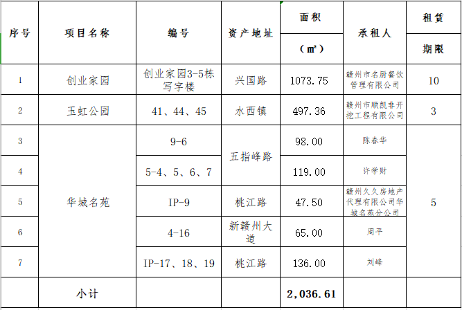 2021528下午1430分,在贛州市公共資源交易中心舉行的贛州振興實業(yè)有限責任公司五指峰路等十三宗資產(chǎn)公開招租(項目編號GZCQ2021073),現(xiàn)將公開招租成交情況公示如下:
