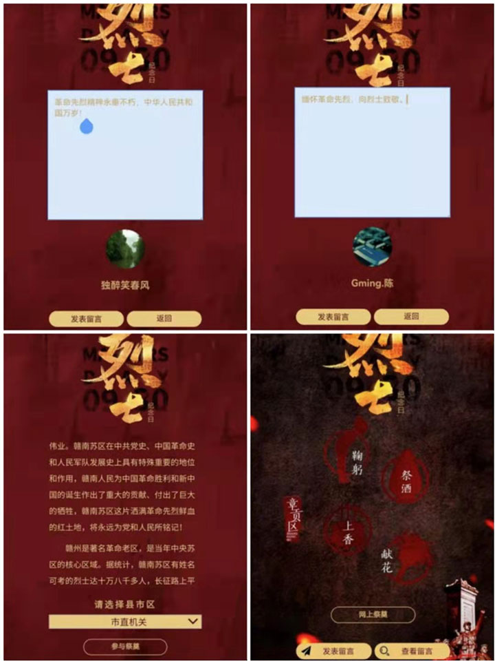 在第八個“烈士紀念日”之際,贛南日報推出了網(wǎng)上祭奠活動。集團積極響應,認真組織集團18個黨支部(黨總支)250余名黨員在辦公室、項目工地、公園廣場、高鐵西站等地現(xiàn)場用手機或電腦,進入贛南日報推出的網(wǎng)絡祭奠平臺,為身邊贛南籍的革命英雄烈士在線鞠躬、祭酒、獻花、上香、留言等形式網(wǎng)上祭奠250余人次,深切緬懷革命先烈,引導黨員感恩前進,牢記使命,大力傳承好紅色基因。
