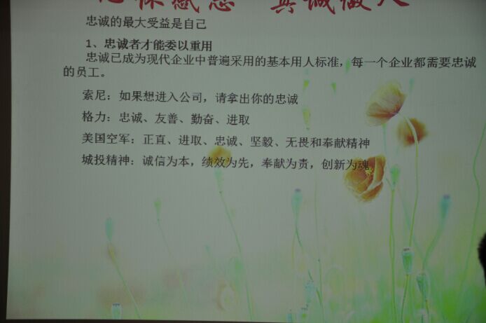 我們城投精神的16字方針:誠信為本,績效為先,奉獻(xiàn)為責(zé),創(chuàng)新為魂。誠信其中一個(gè)表現(xiàn)就是忠誠。