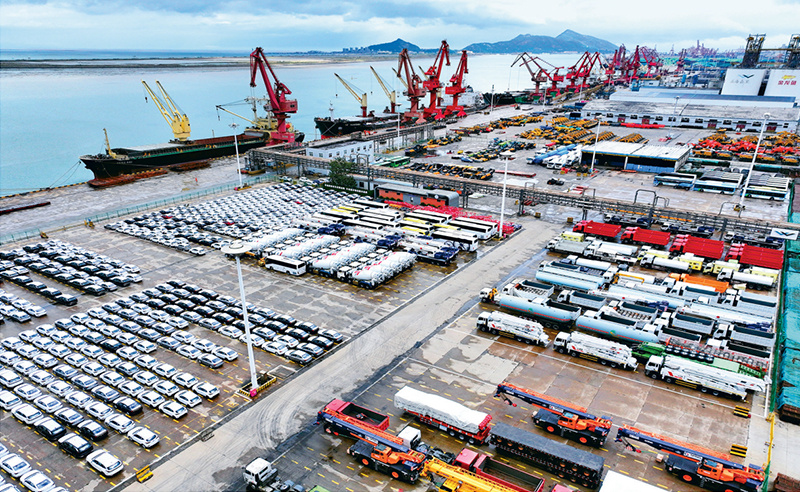 江蘇全面把握在全國開放格局中的發(fā)展定位,發(fā)揮“一帶一路”交匯點優(yōu)勢,聚焦建設(shè)具有世界聚合力的雙向開放樞紐的目標,加快推進高水平對外開放,外貿(mào)進出口總額連續(xù)多年居全國前列。圖為2024年10月18日,在江蘇省連云港東方港務(wù)分公司碼頭,大批國產(chǎn)車輛集港準備裝船(無人機照片)。新華社發(fā) 王春/攝